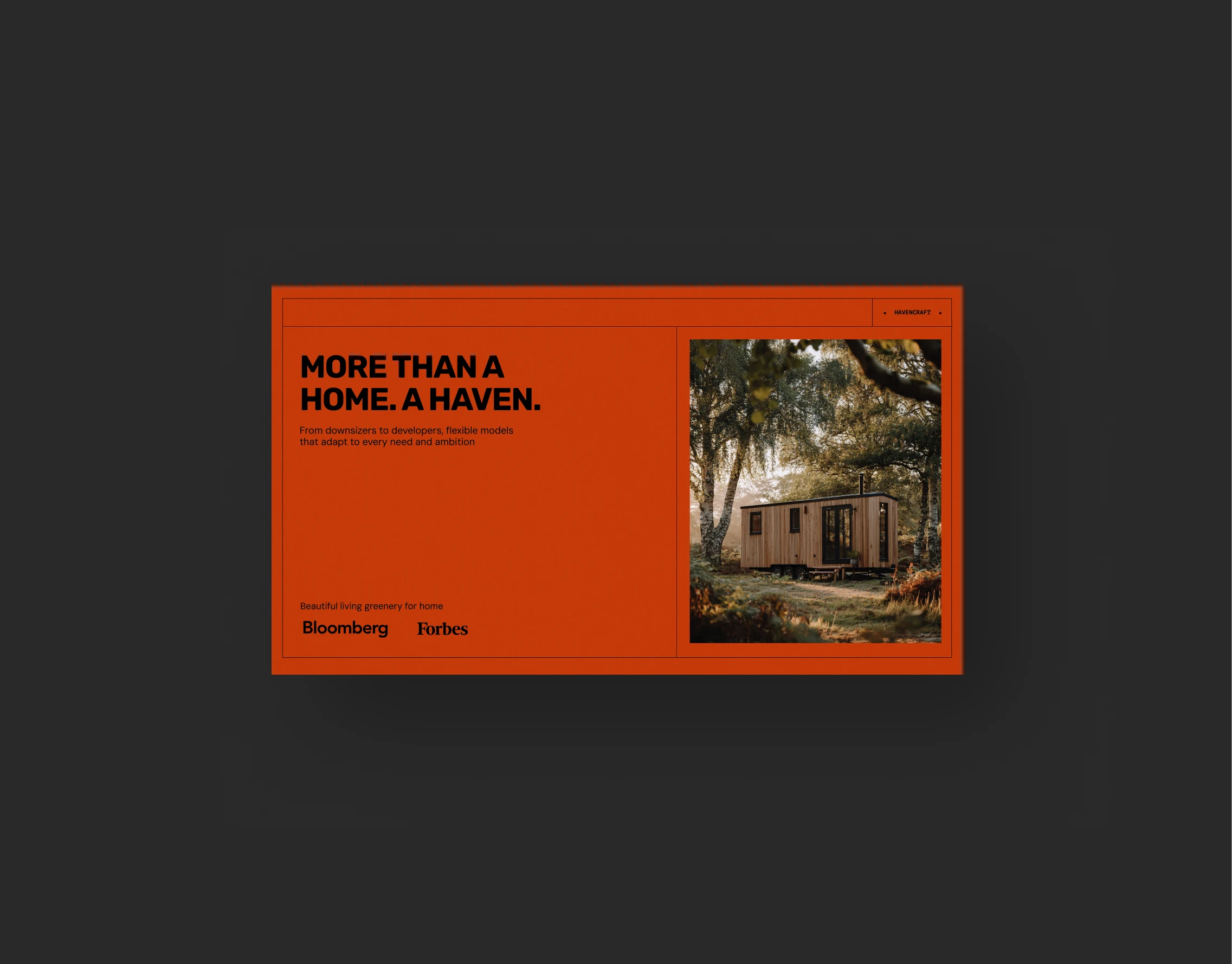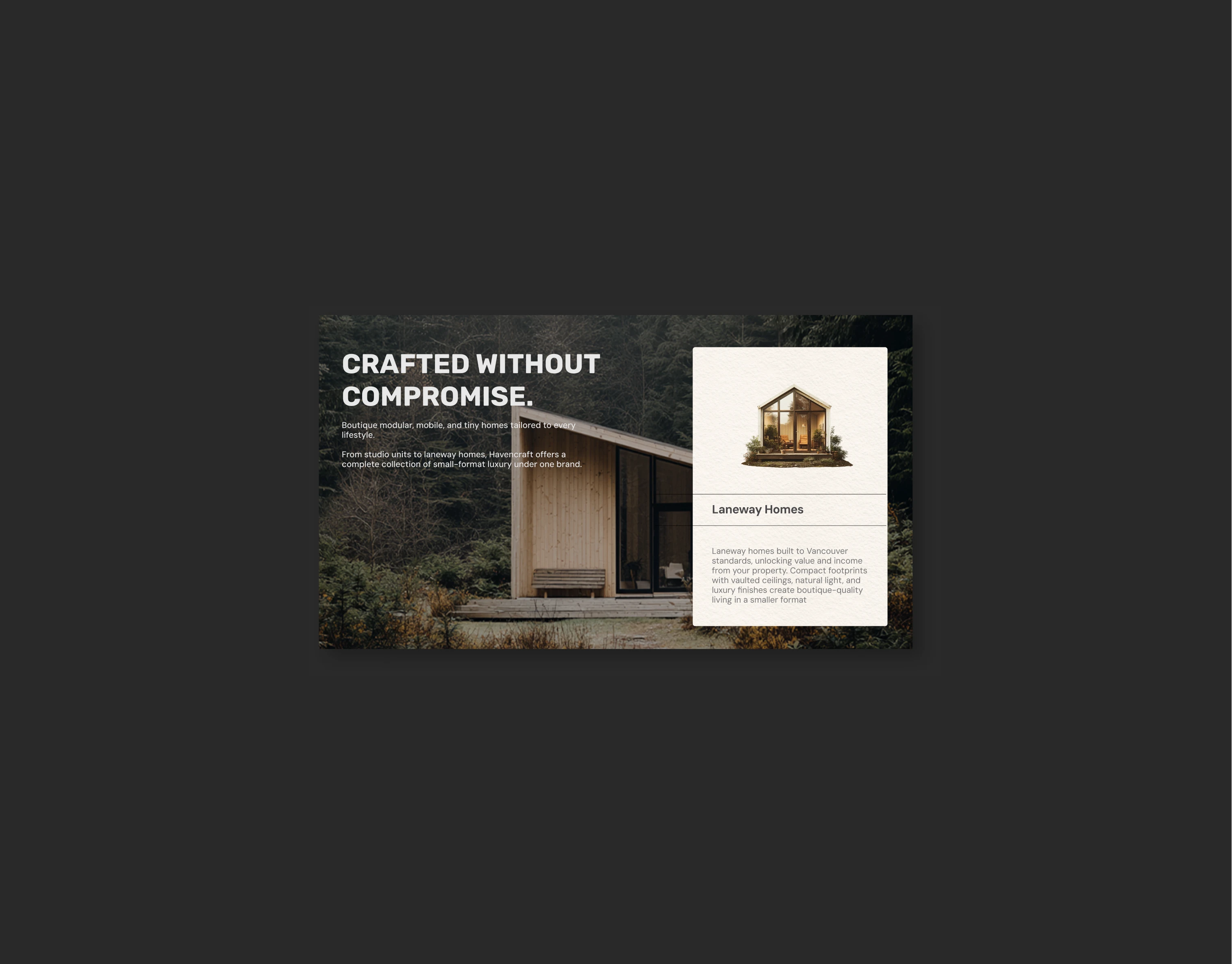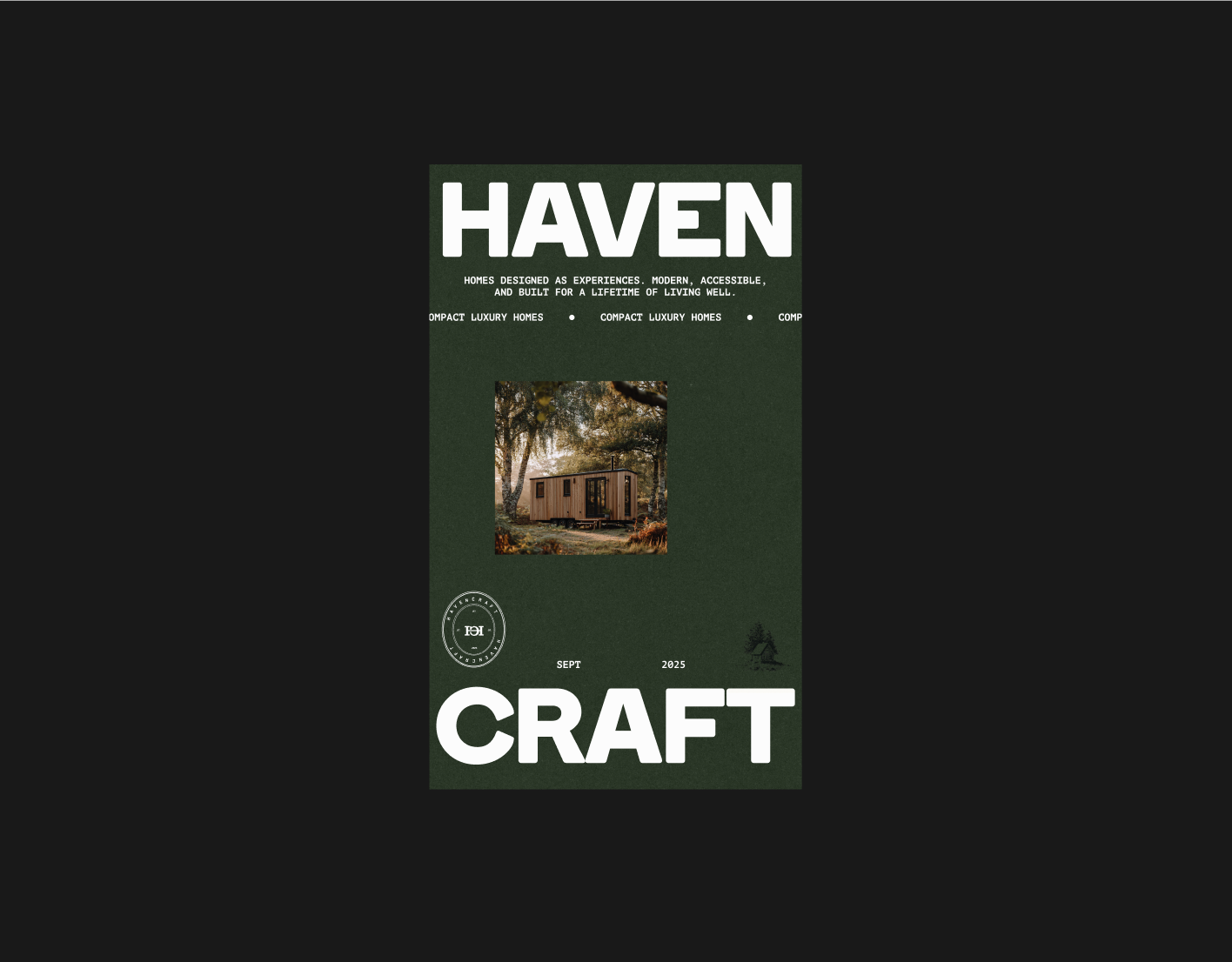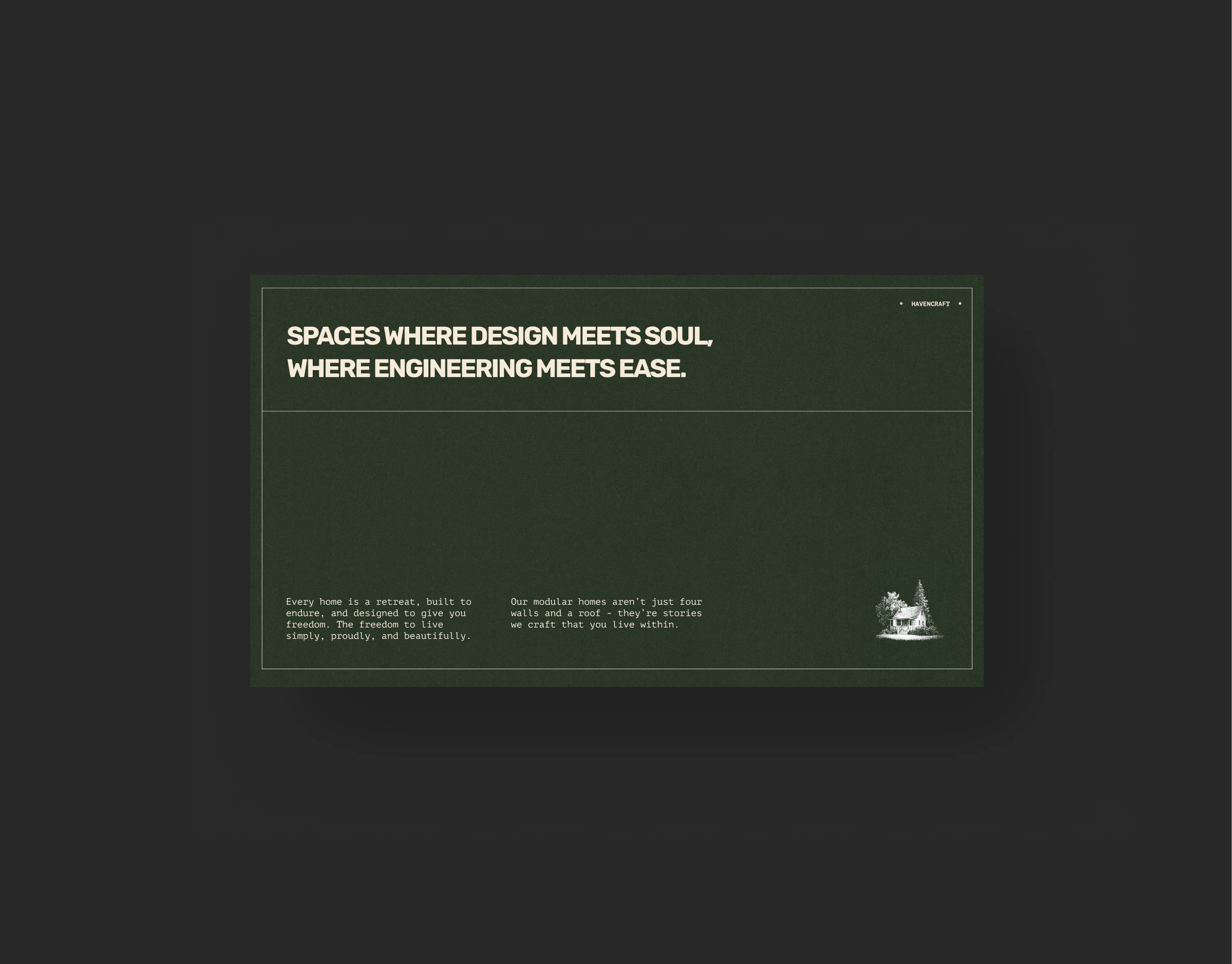 We developed a warm, approachable voice that inspires confidence while celebrating simplicity and community. The visual and verbal identity came together to position Havencraft not just as a housing option, but as a movement toward intentional living in Canada.