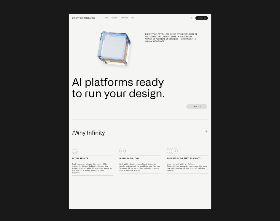 We are thrilled to have played a pivotal role in shaping the brand identity and digital experience for Infinity Constellation, a dynamic foundry that powers ideas and founders from the ground up, building the next generation of groundbreaking companies. Chosen as their agency of choice, we provide innovative solutions, design, communications/marketing, and strategy to support Infinity’s business units.
