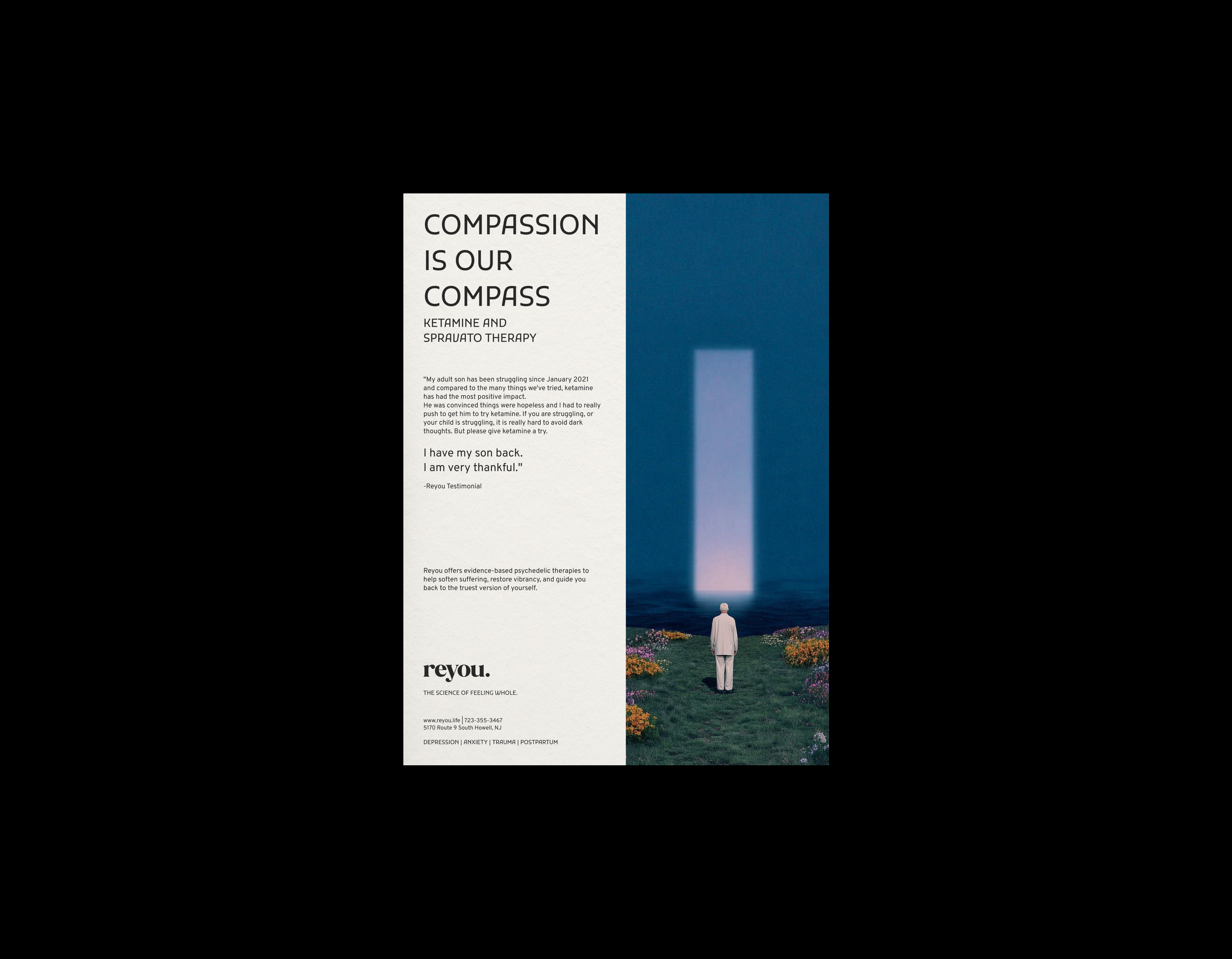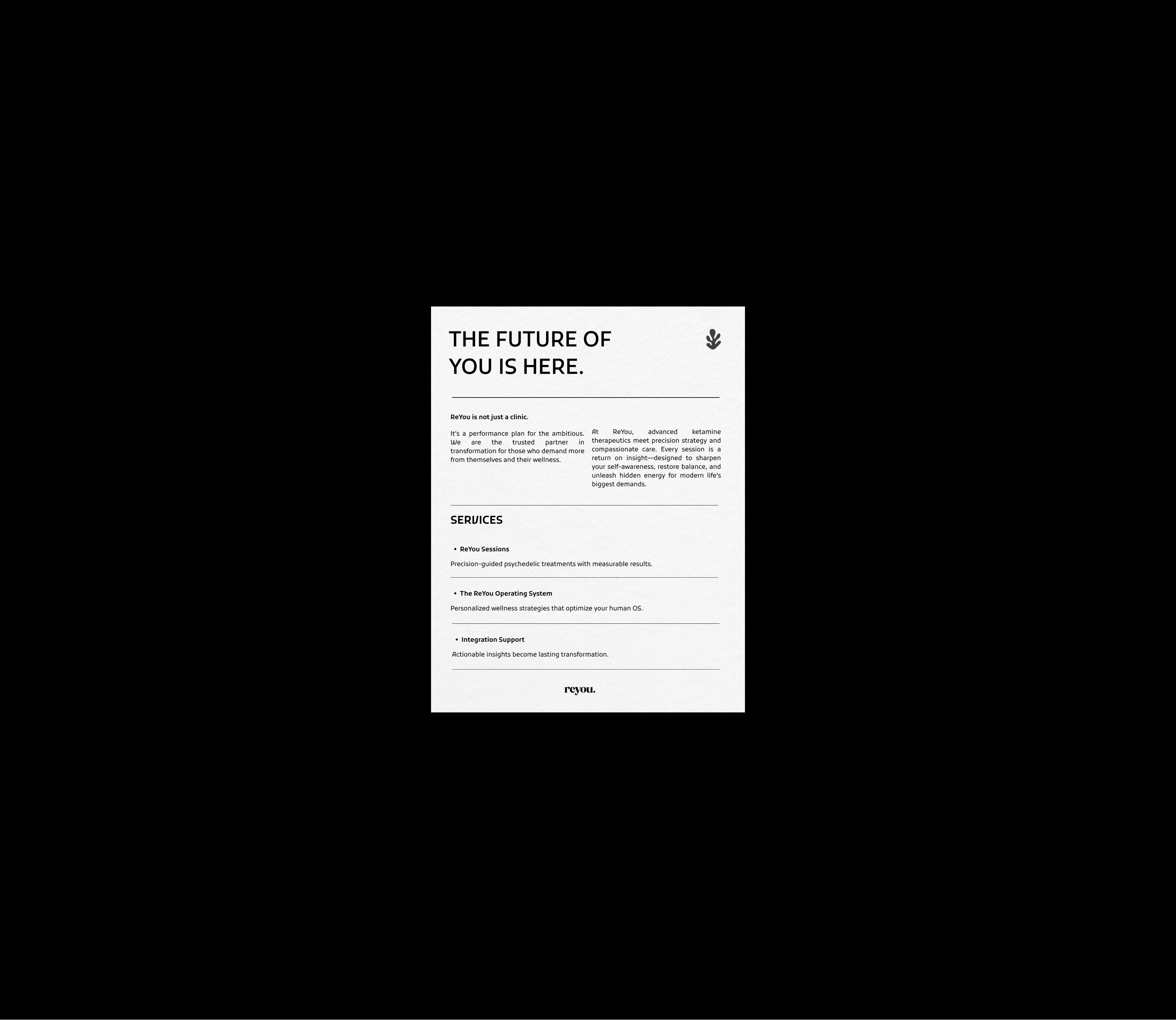 We partnered with ReYou to craft a brand, strategy, and digital presence as bold and transformative as their mission. ReYou is redefining wellness by placing ketamine-based therapeutics alongside traditional medicine, empowering high-performance individuals to unlock their full mind-body potential.