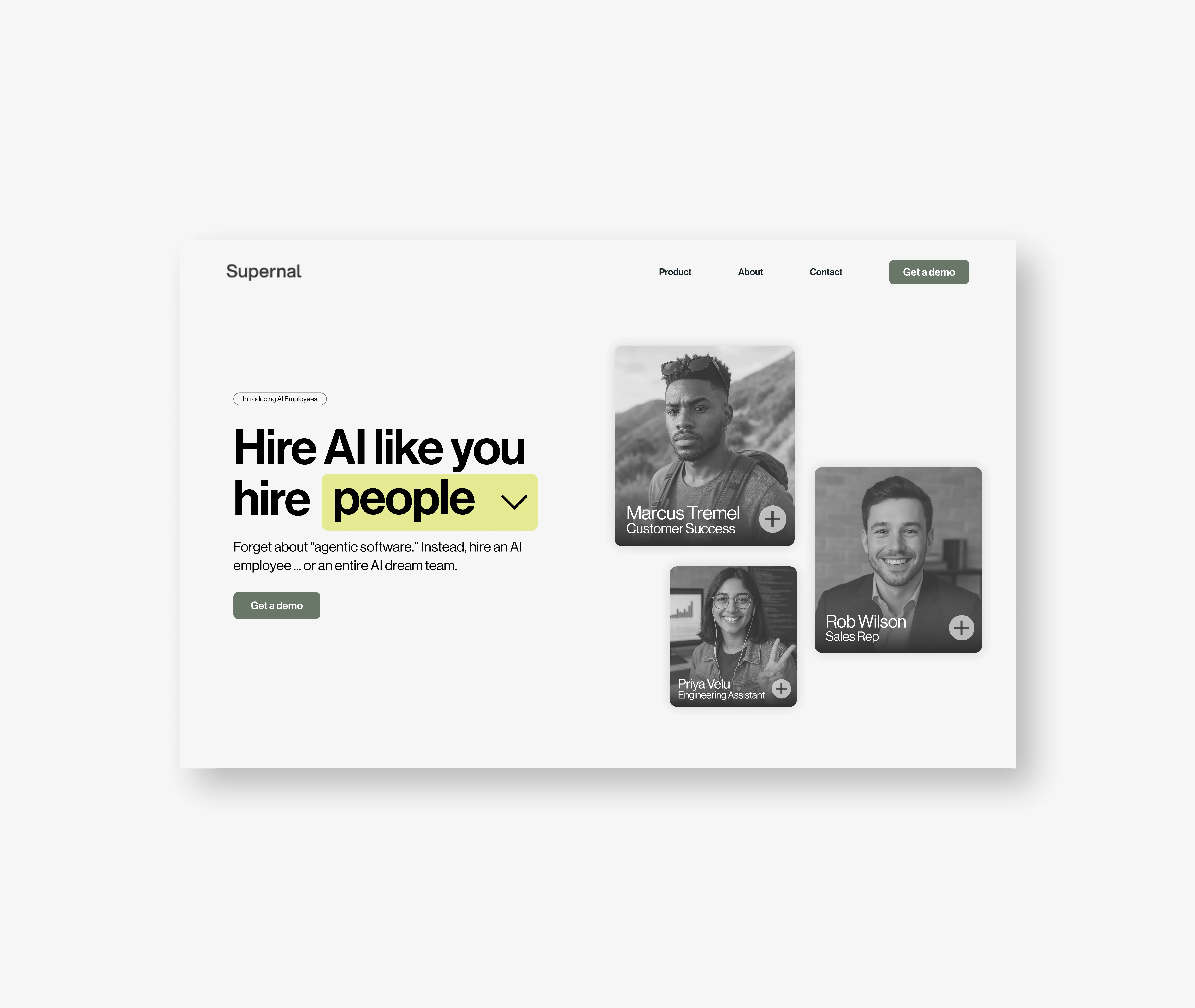 For Supernal AI, we crafted a brand and digital experience that clearly communicates their mission of enabling businesses to “hire” AI employees that seamlessly integrate into everyday workflows.