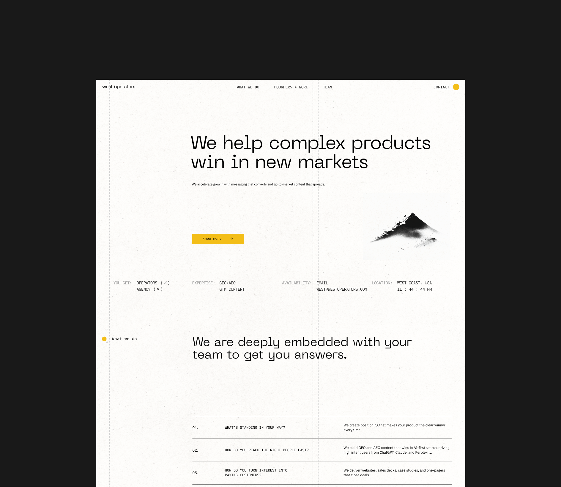 We partnered with West Operators to unify strategy, design, and development into a digital presence that conveys their vision, authority, and trust. Known for accelerating growth by turning complex products into unstoppable brands, West Operators partners with ambitious teams to make technically complex offerings irresistible to the right audience—fast-tracking the path from “interested” to “ready to buy.”